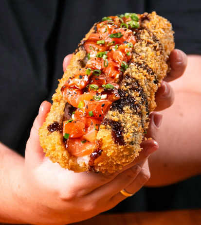 Cone de alga recheado com arroz, salmão e creamcheese, empanado e frito finalizado com tarê, gergelim e cebolinha;