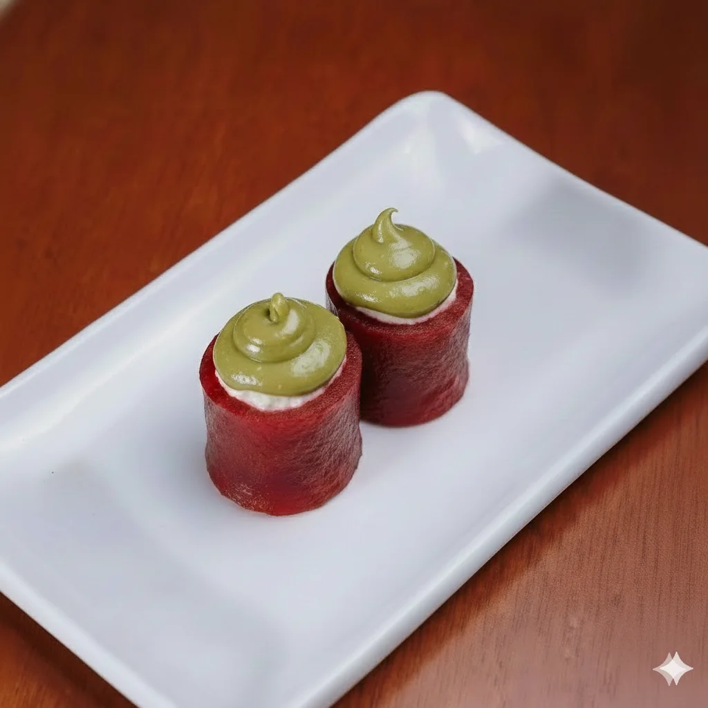 4 peças de lamina de goiabada recheadas com creamcheese coberto com creme de pistache