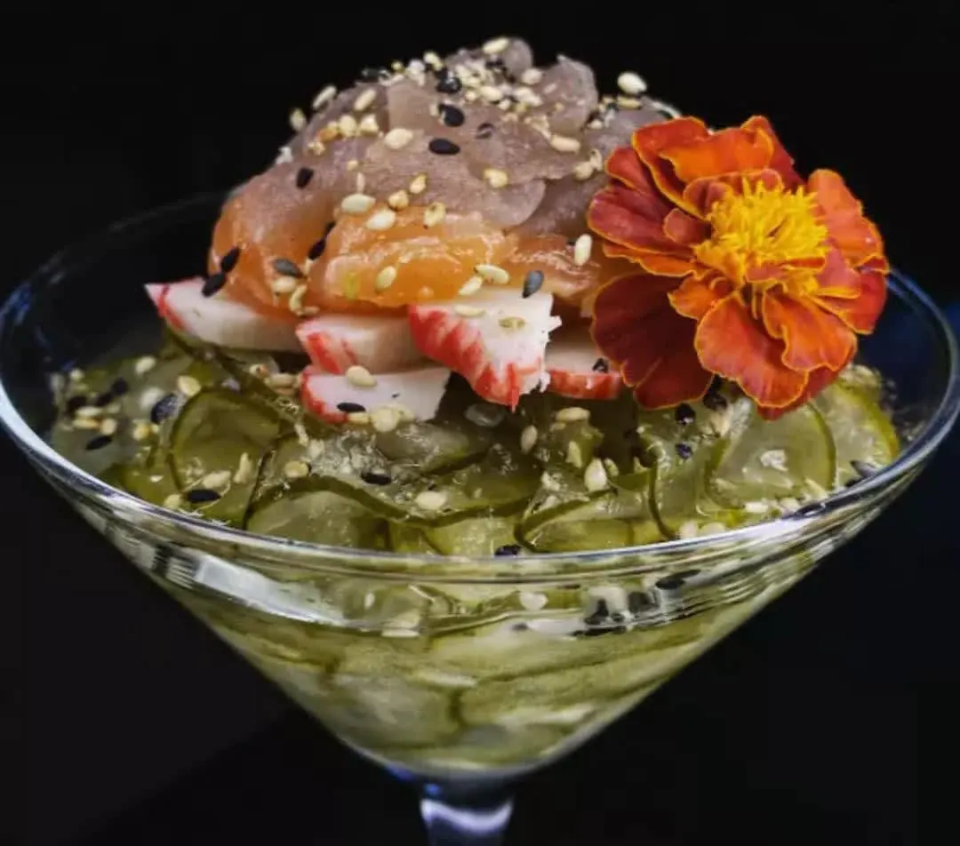 Salada de pepino agridoce, kani e peixe branco e salmão.