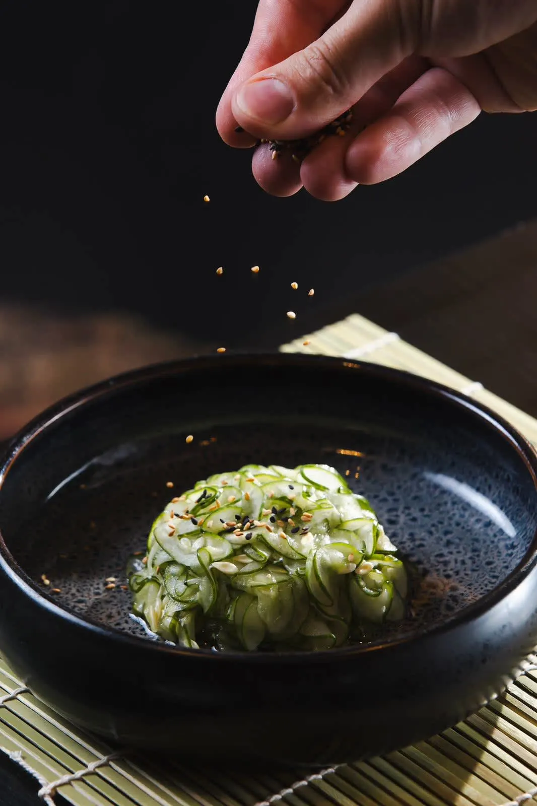 Pepino desidratado ao molho agridoce finalizado com gergelim.